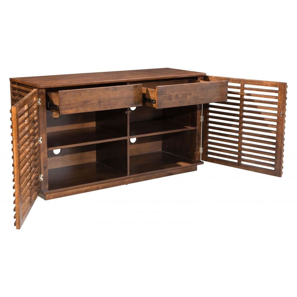 De diseño escandinavo, la serie Linea presenta tiras estrechas y delgadas de madera maciza de abeto, creando un diseño moderno y aireado con un rico acabado en nogal. Credenza cuenta con dos puertas frontales que se abren, 2 cajones interiores con dos estantes ajustables y orificios para acceder a los componentes del televisor.